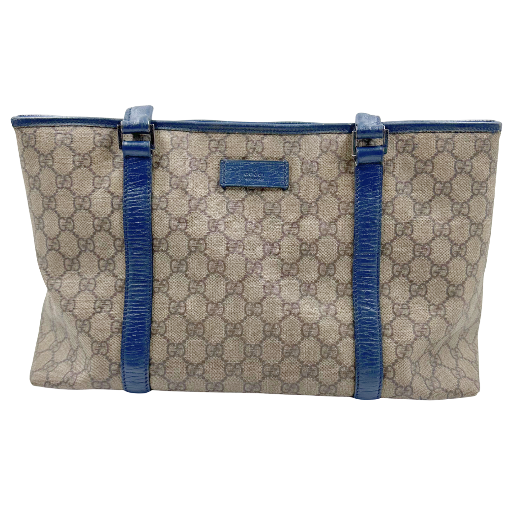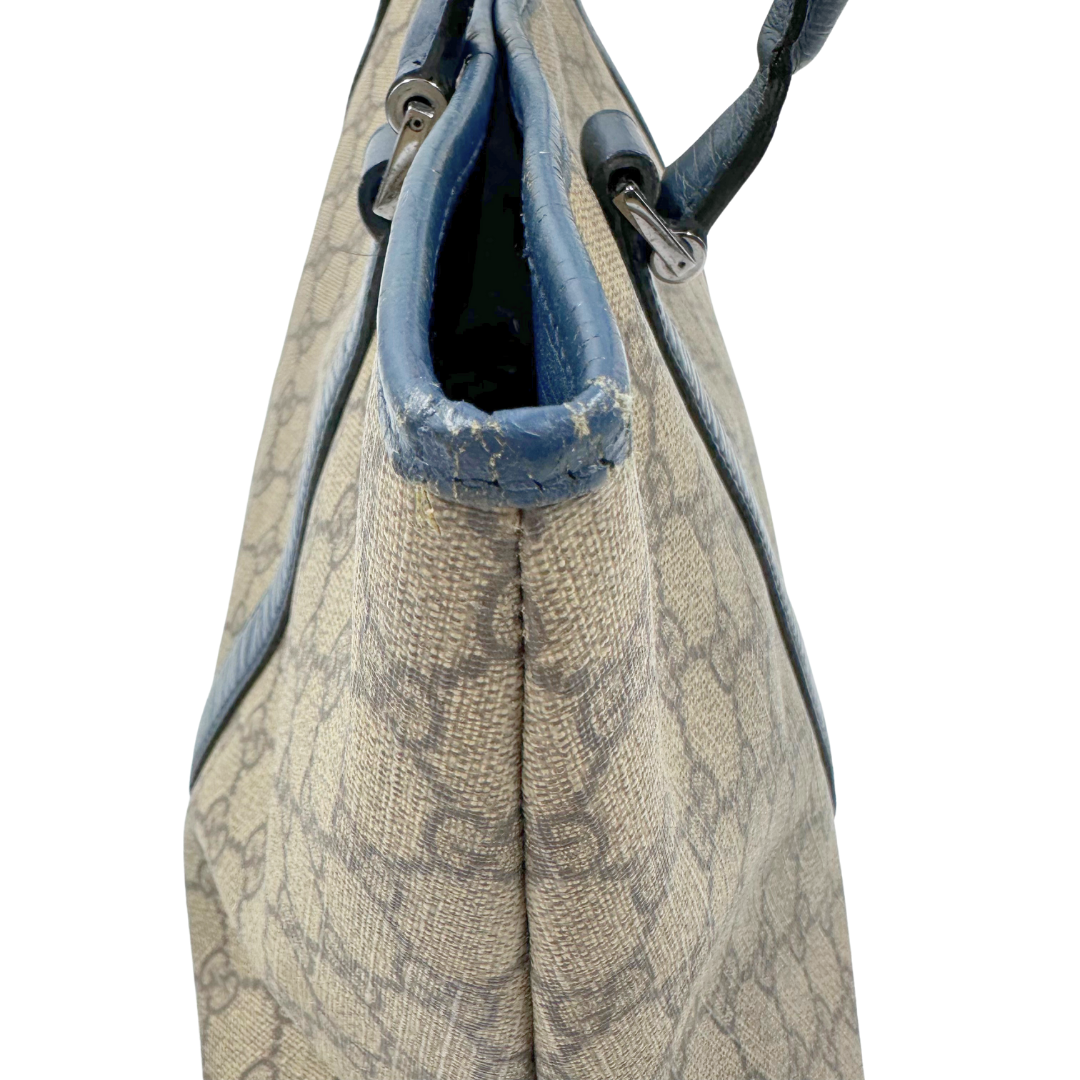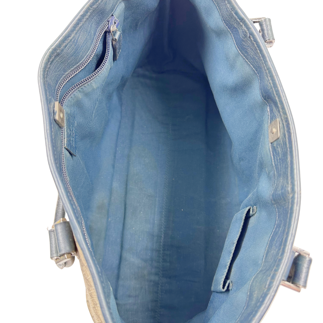 Iconic Gucci shoulder bag combining signature GG coated canvas with rich blue leather accents and polished silver hardware. The magnetic button closure provides secure fastening, while the coordinating blue fabric-lined interior offers practical organization.