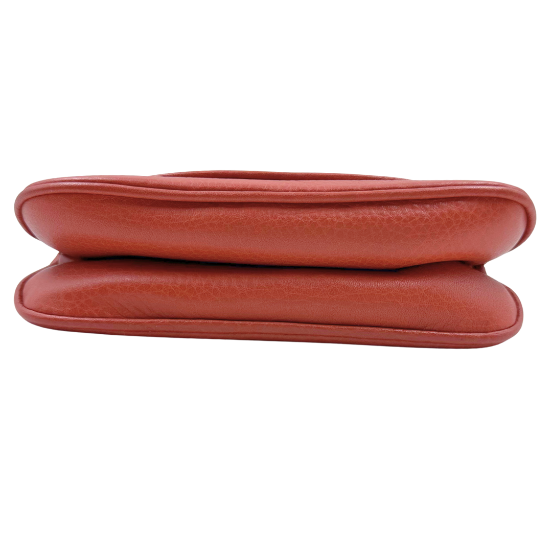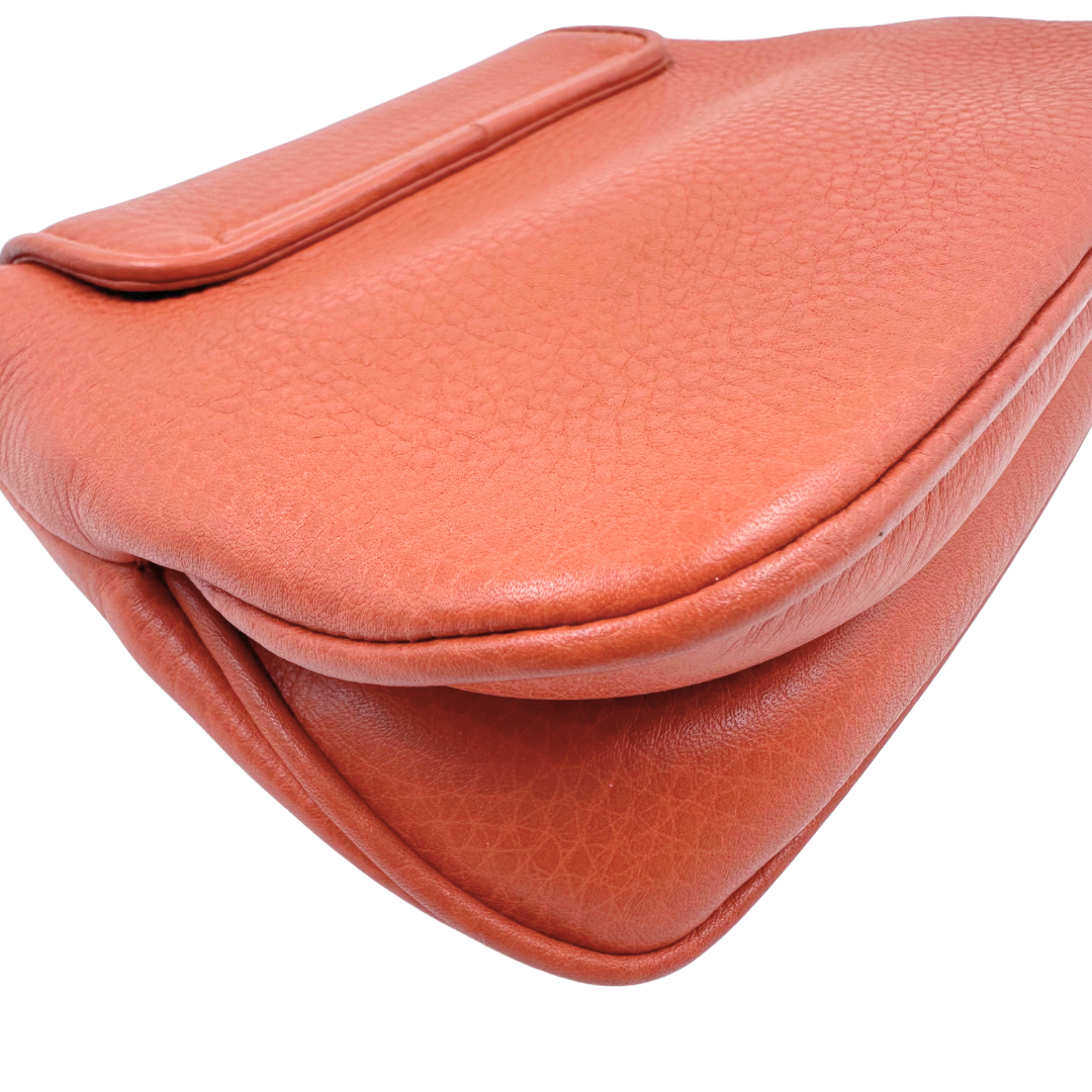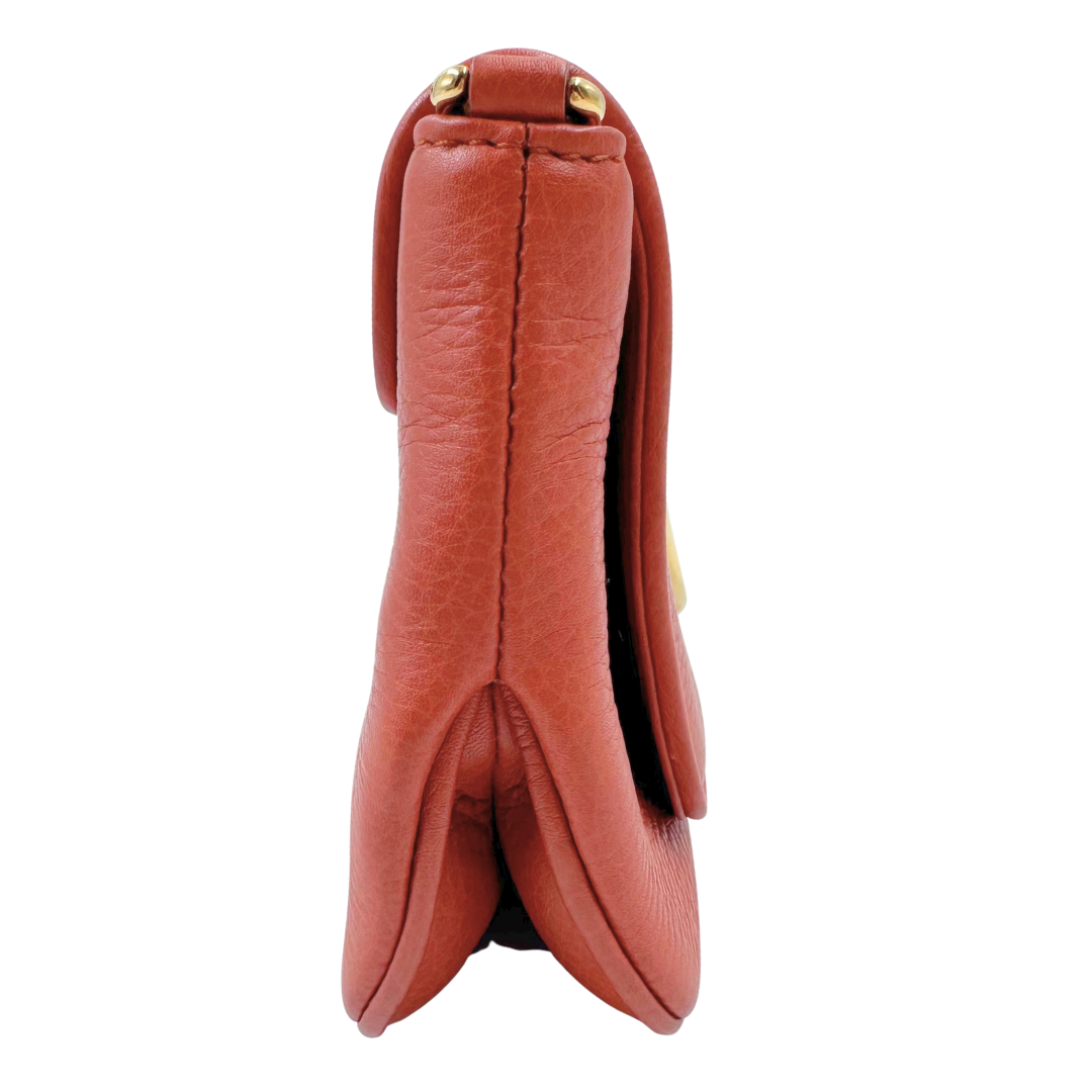 Versatile two-way bag in warm burnt orange leather with elegant gold hardware and secure magnetic button closure. The chain crossbody strap offers flexible styling options, while the luxurious suede-lined interior provides a refined finishing touch.