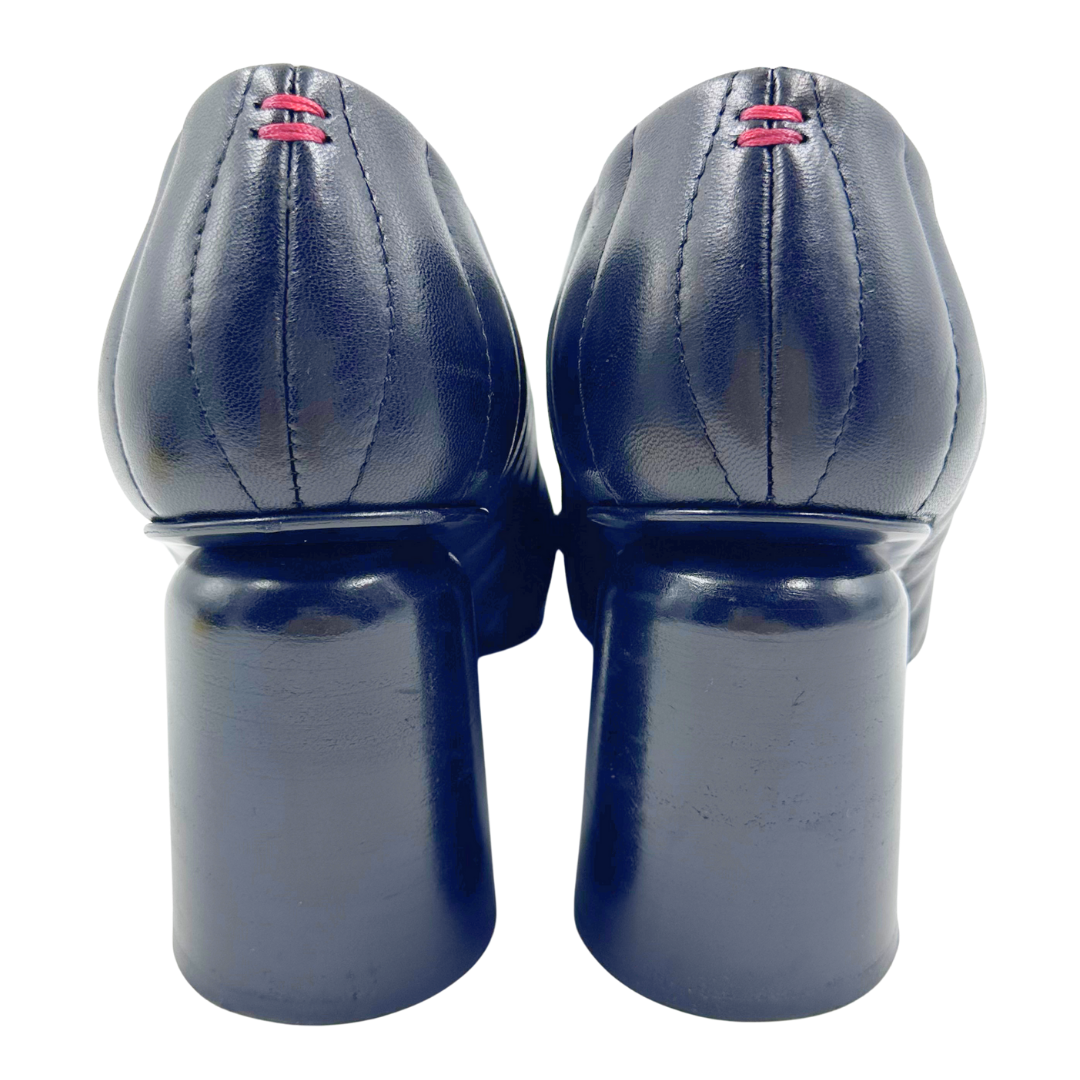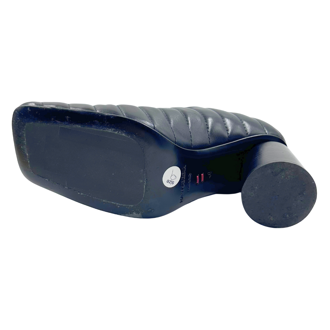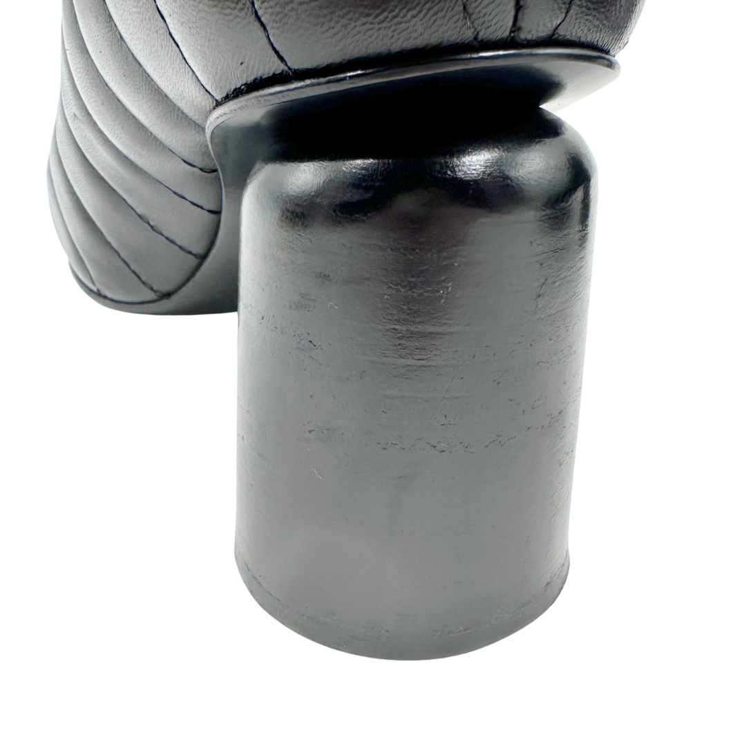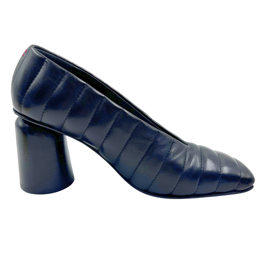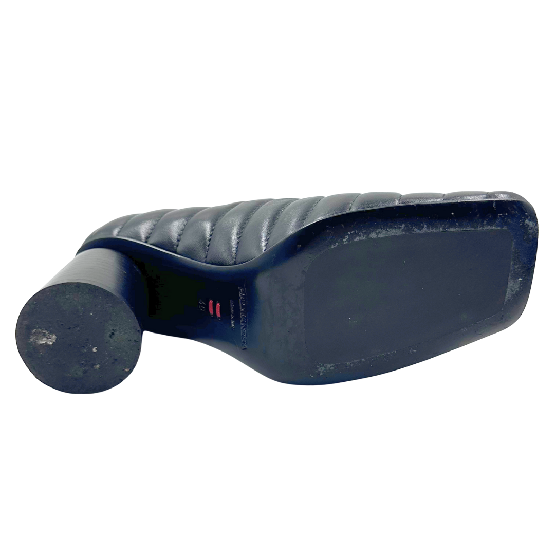 The Halmanera Black Leather Pumps feature quilted black leather, an angular toe, and a stable round block heel, combining style with comfortable wear for the office or events.