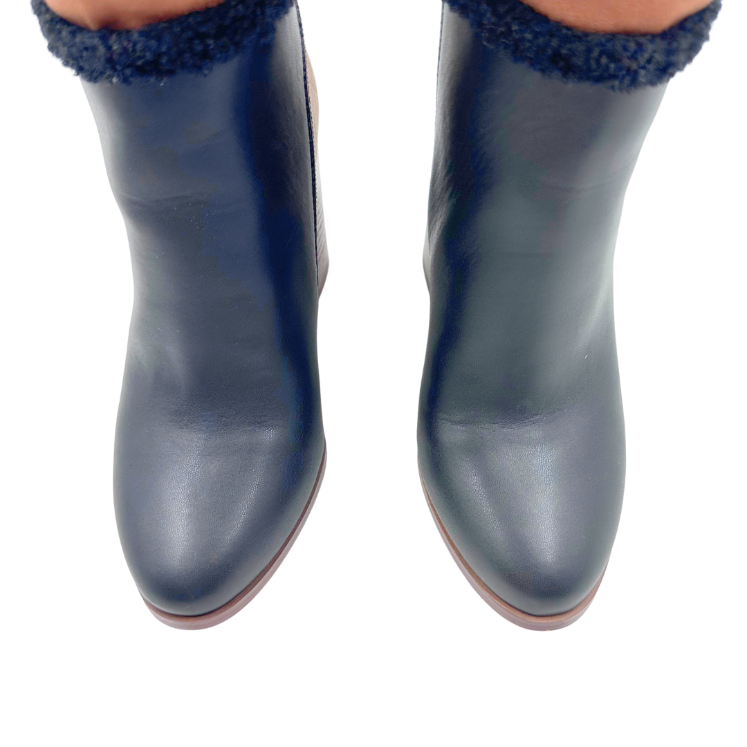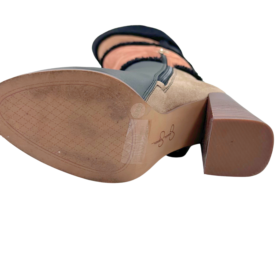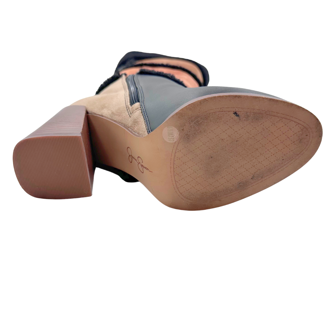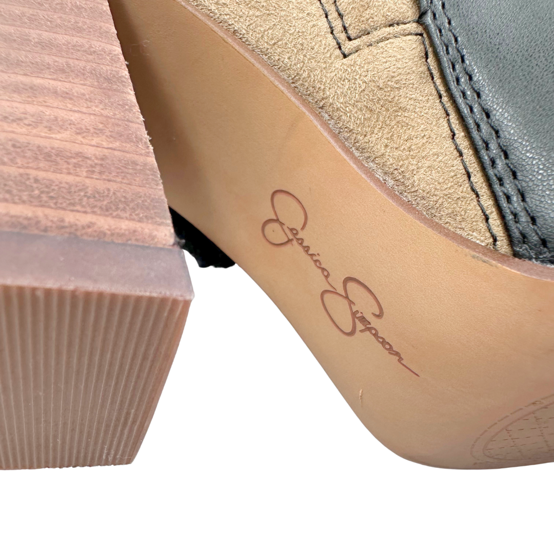 Jessica Simpson boots in size 6.5 showcase multi-color patchwork accented with black shearling. Featuring a side zip entry, round toe, and sturdy block heel, they combine style and comfort effortlessly.