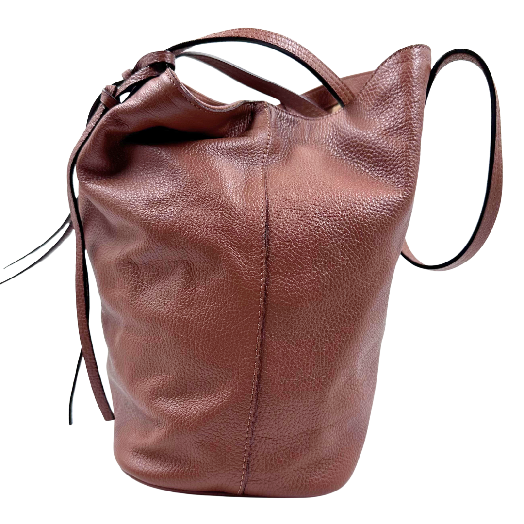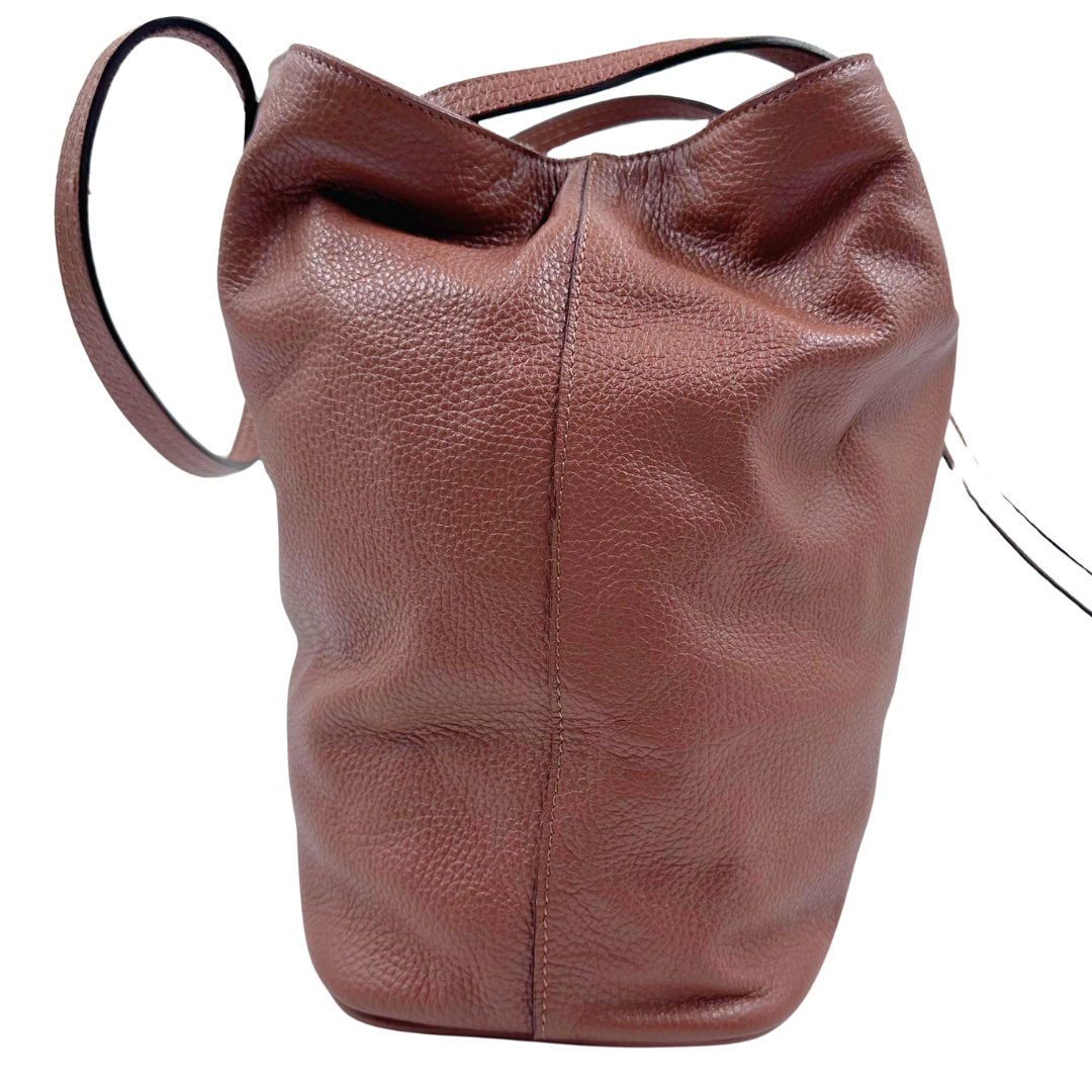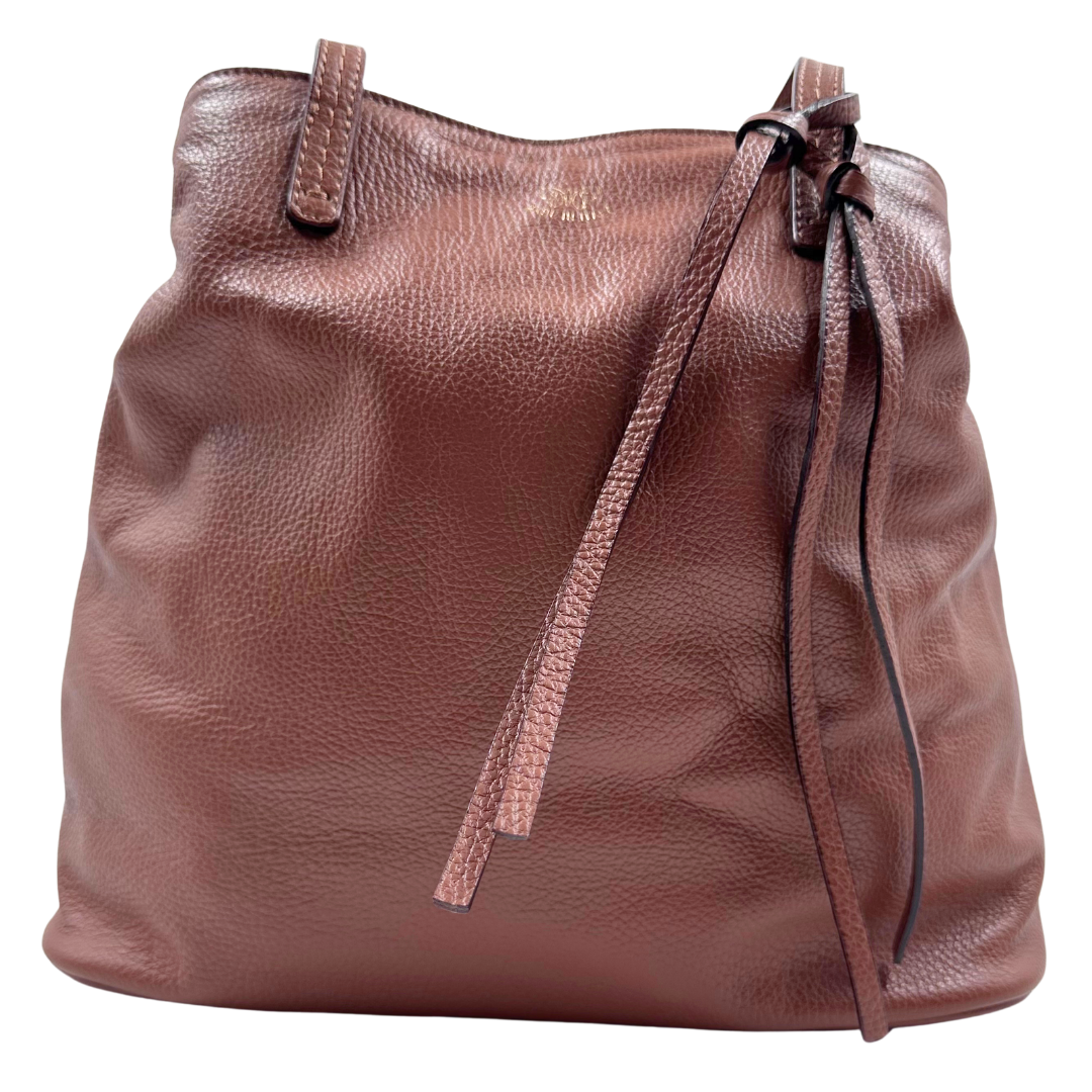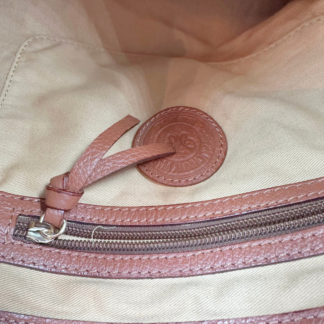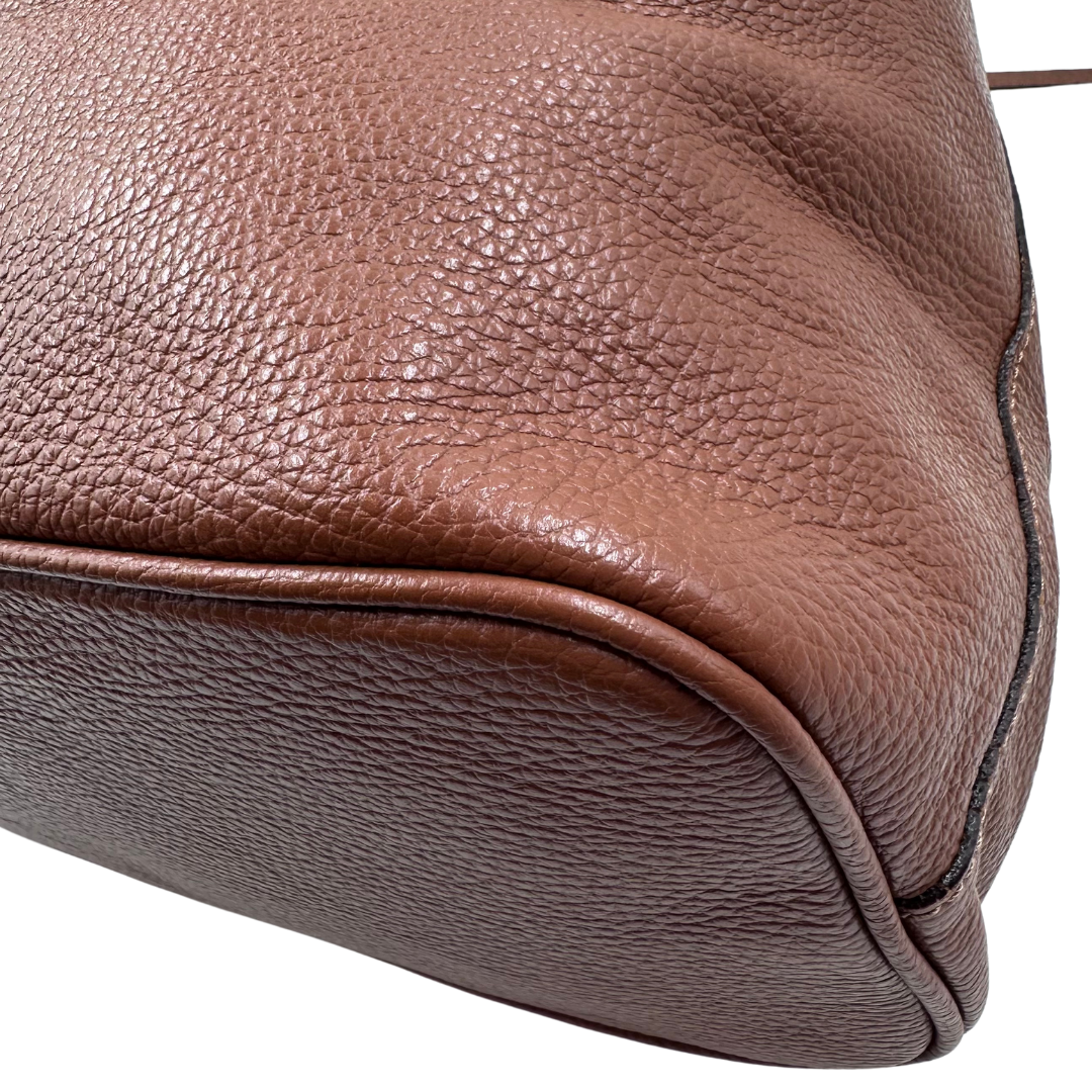 The Johnny Was Hobo showcases rich brown leather accented with tassel details and gold hardware. Inside, a fabric-lined interior features a zip compartment and a secure internal clip closure for organized convenience.