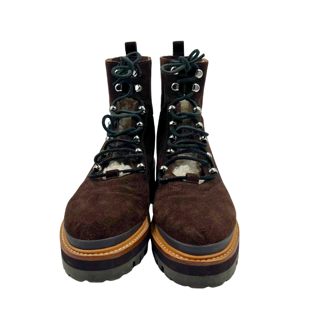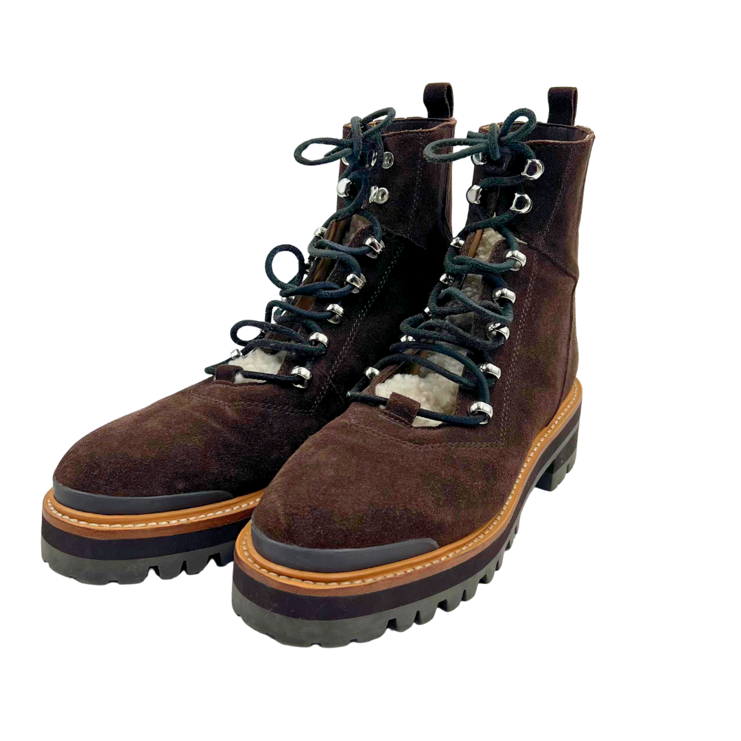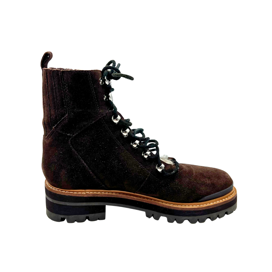 These Marc Fisher booties combine comfort and style in rich brown suede with a cozy sherpa tongue detail. The lace-up front provides a secure fit, while polished silver hardware adds contemporary appeal. A convenient back elastic panel ensures easy on-and-off wear, making these versatile booties perfect for transitional dressing and everyday sophistication.