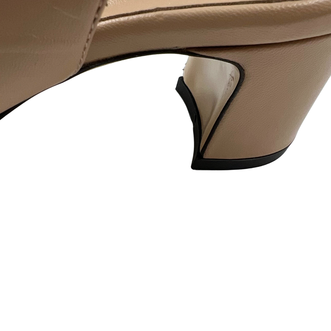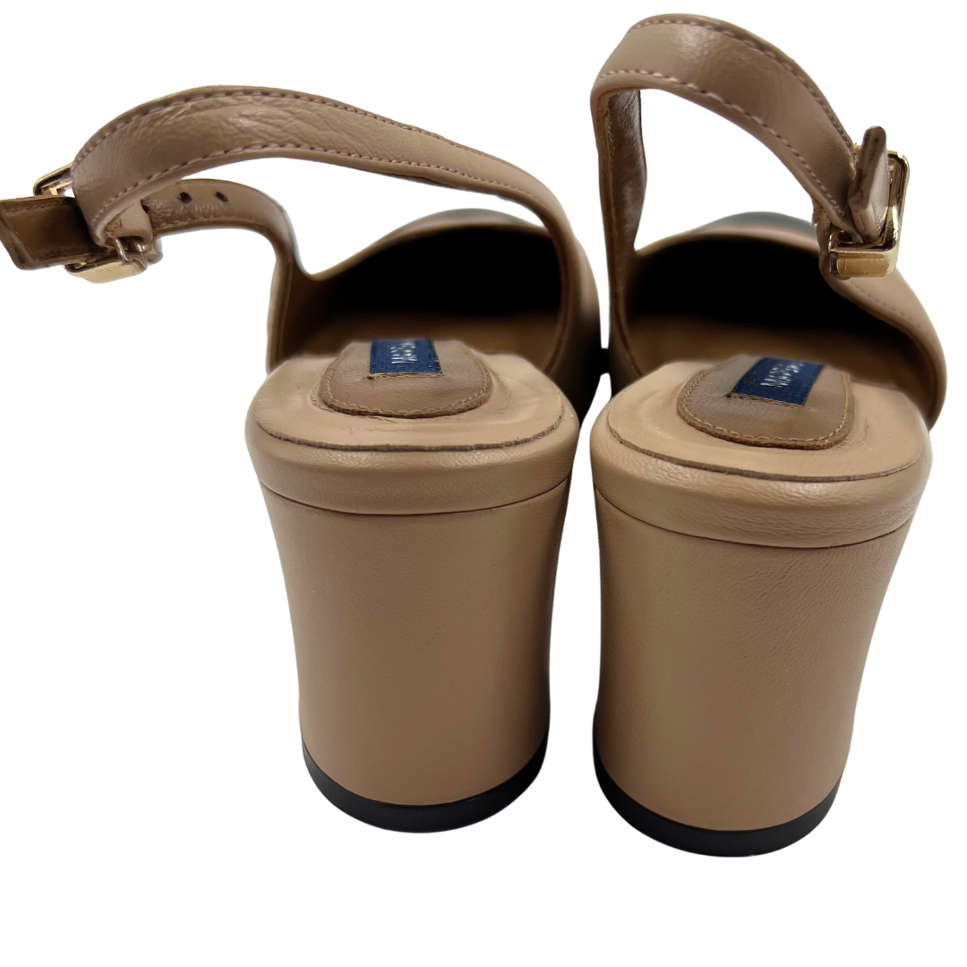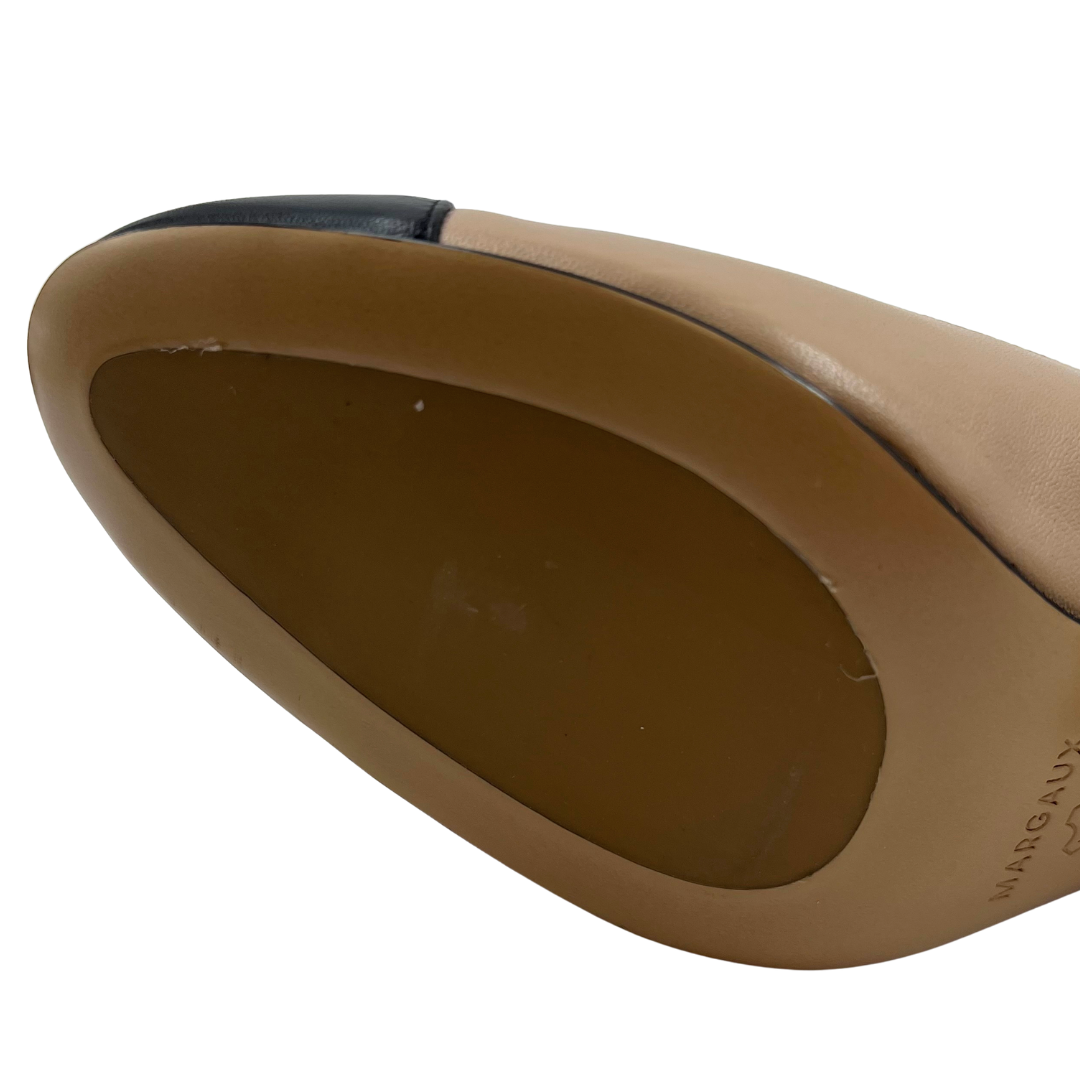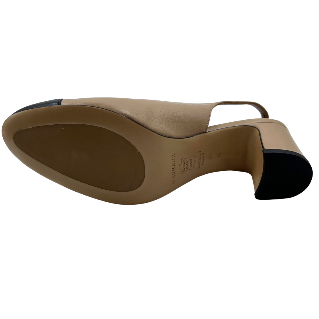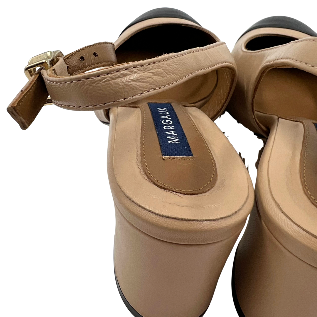 These Margaux heels combine black cap toe leather with nude leather accents, featuring gold hardware, an ankle strap, and a sturdy block heel for balanced elegance.