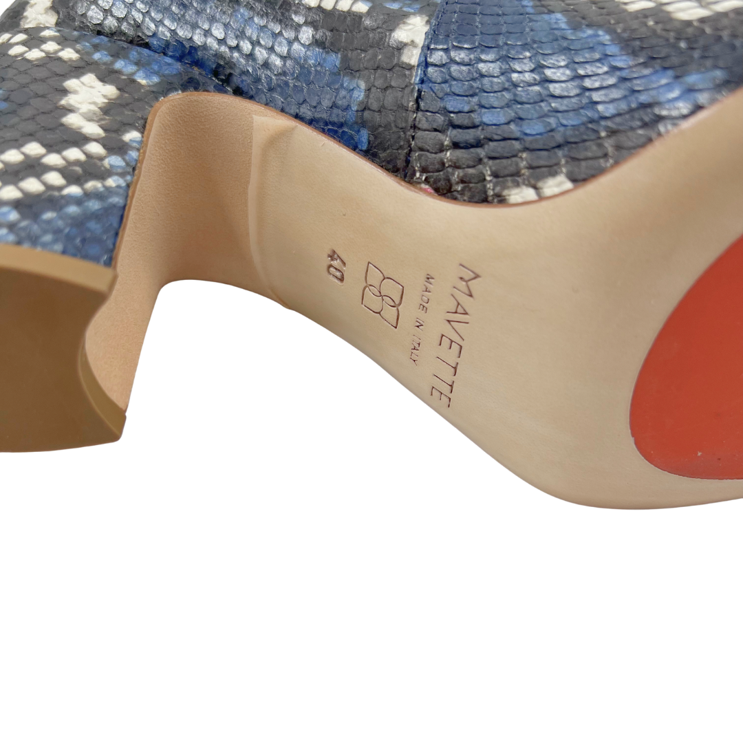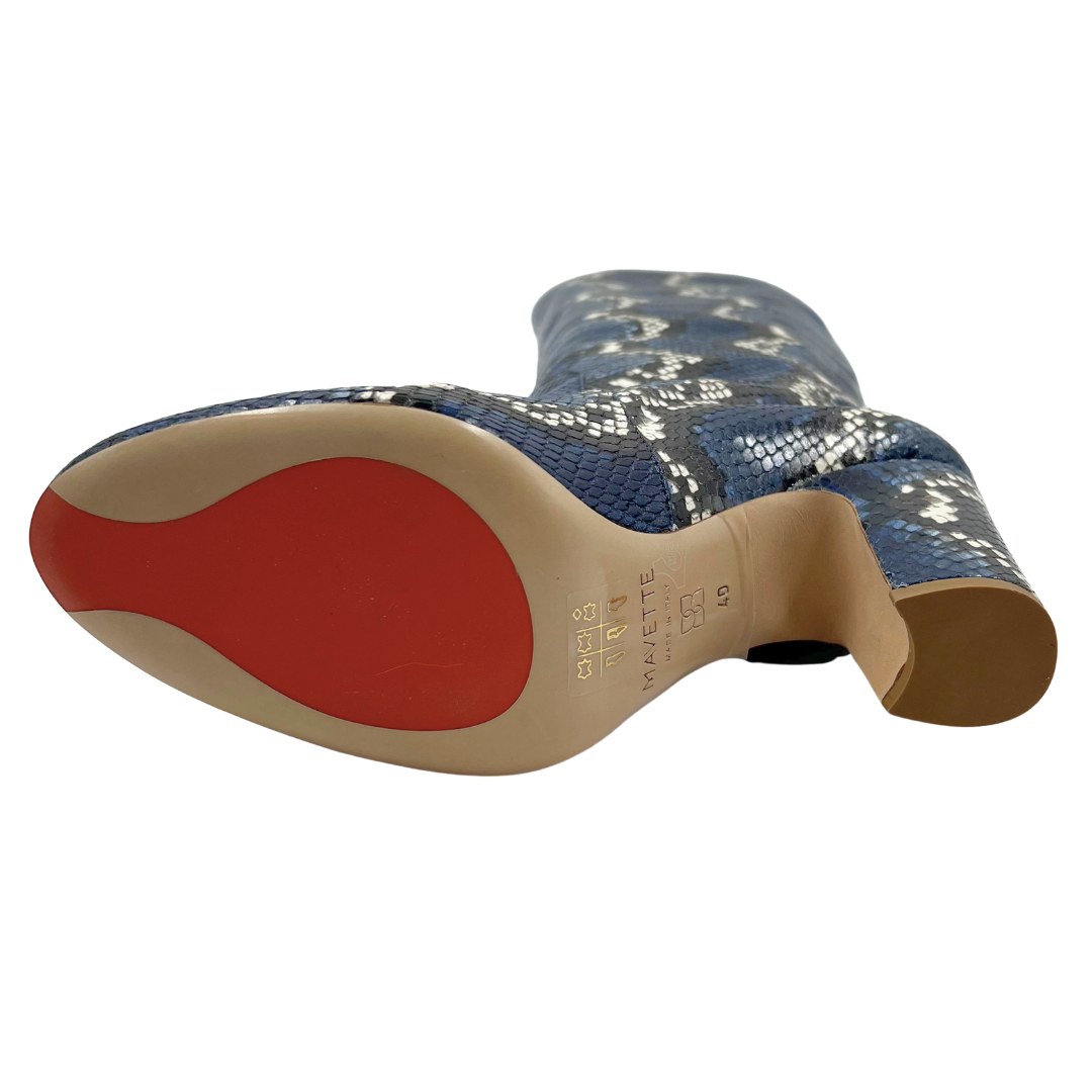 Make a bold statement with these striking blue and white python skin knee-high boots by Mavette. The distinctive patterned leather creates visual interest while the extended silhouette offers versatile styling options.