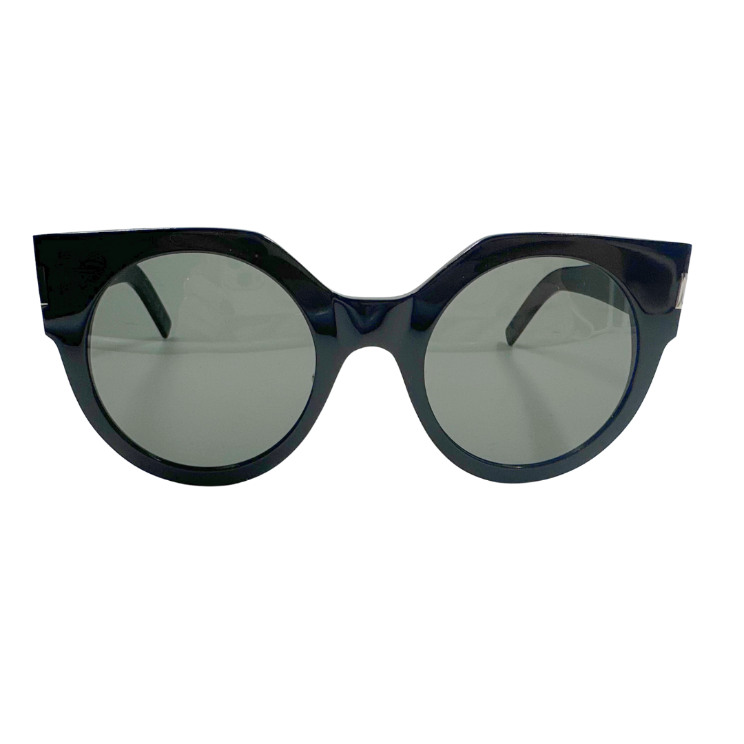 Timeless Saint Laurent sunglasses featuring a striking circular cat-eye frame in black acrylic with matching dark lenses and refined silver hardware. Understated branding maintains the sophisticated aesthetic of this iconic silhouette.