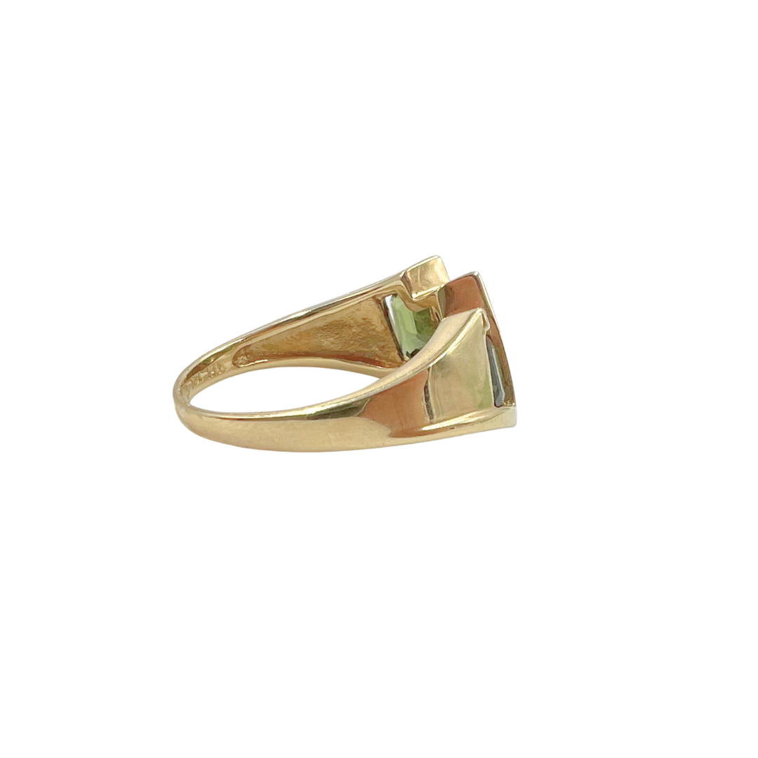 Exquisite Samuel Aaron ring crafted in 14k gold, featuring three vibrant green sapphire stones.